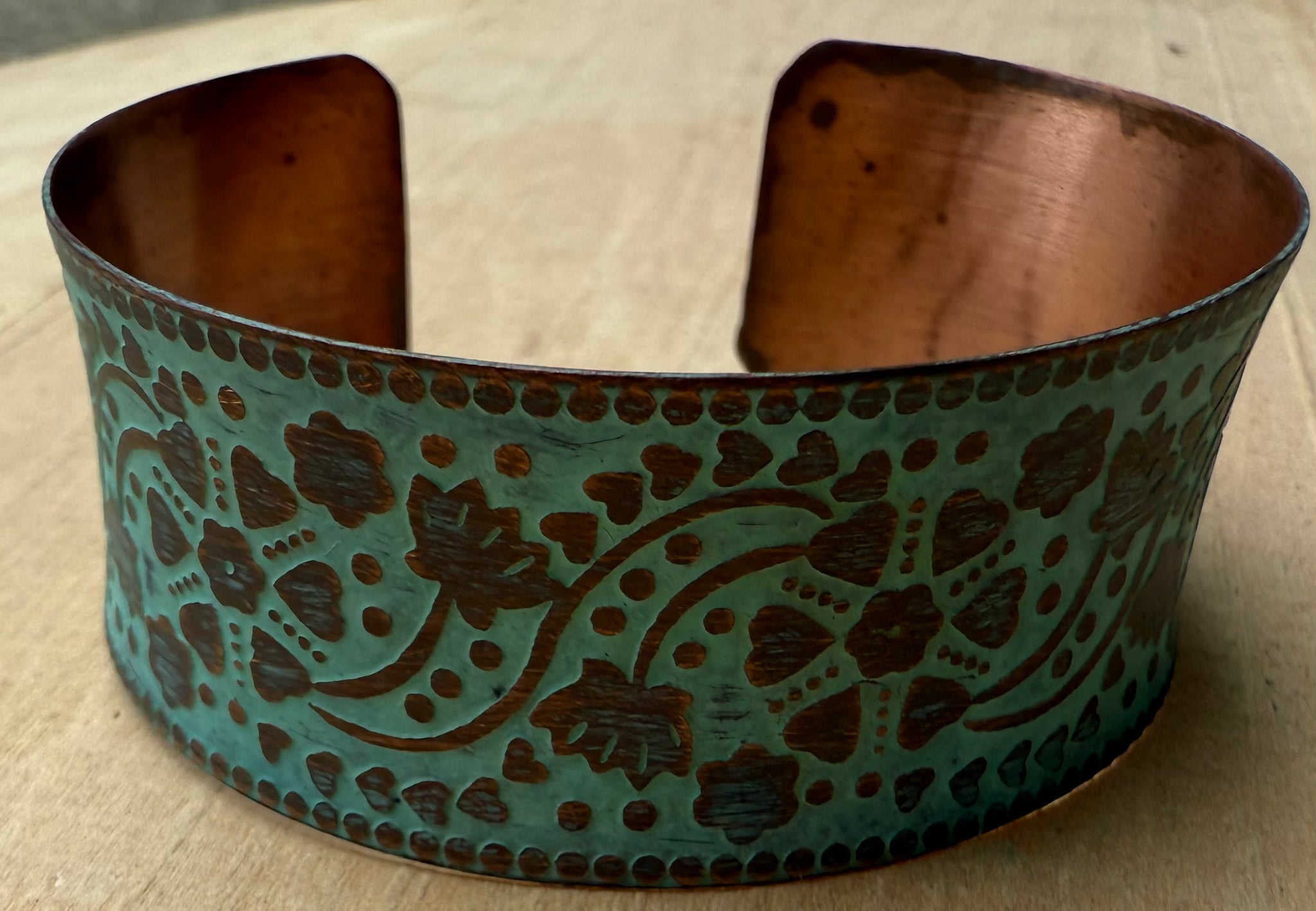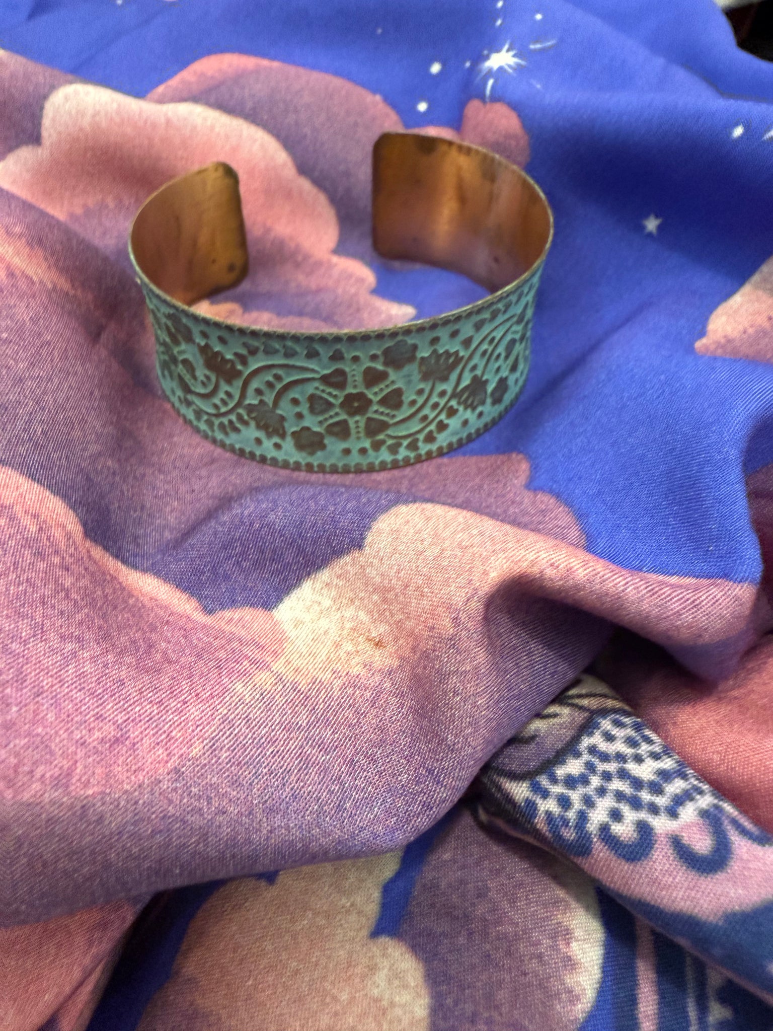 Beautiful copper patina cuff goes perfectly with any of our silky kimonos, but especially the moon style.