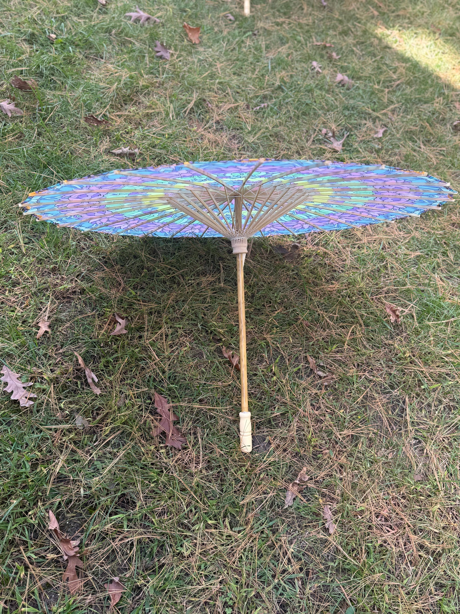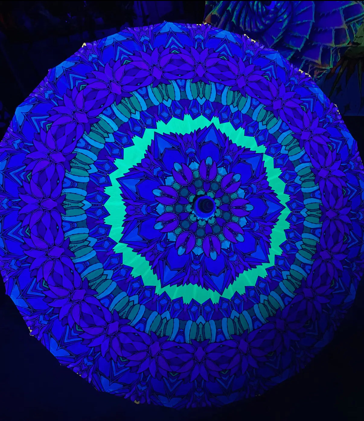 Another gorgeous parasol from the artists at Enlightened! This beautiful parasol is UV Reactive making it the perfect accessory for your next festival. Support artists and small businesses with this purchase ❤️❤️❤️