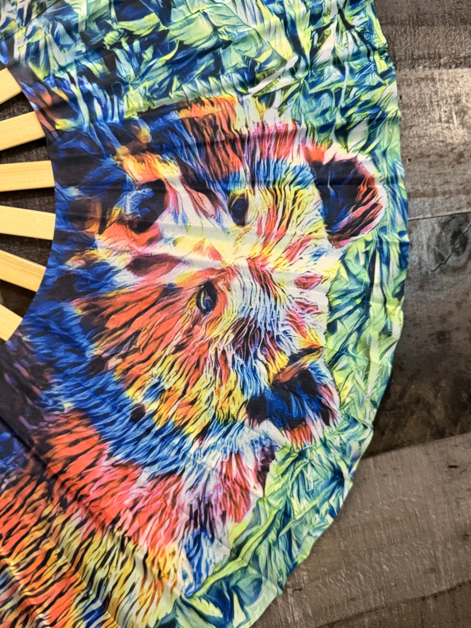 Made to be  sturdy with sublimated acrylic fabric, this fan is not only durable, but also provides a refreshing gust of wind to keep you cool during these long festival days and nights. This fabric will never fade or bleed so you can enjoy this stunning artwork for years to come. This beautiful fan was designed by the enlightened clothing company and Artists.