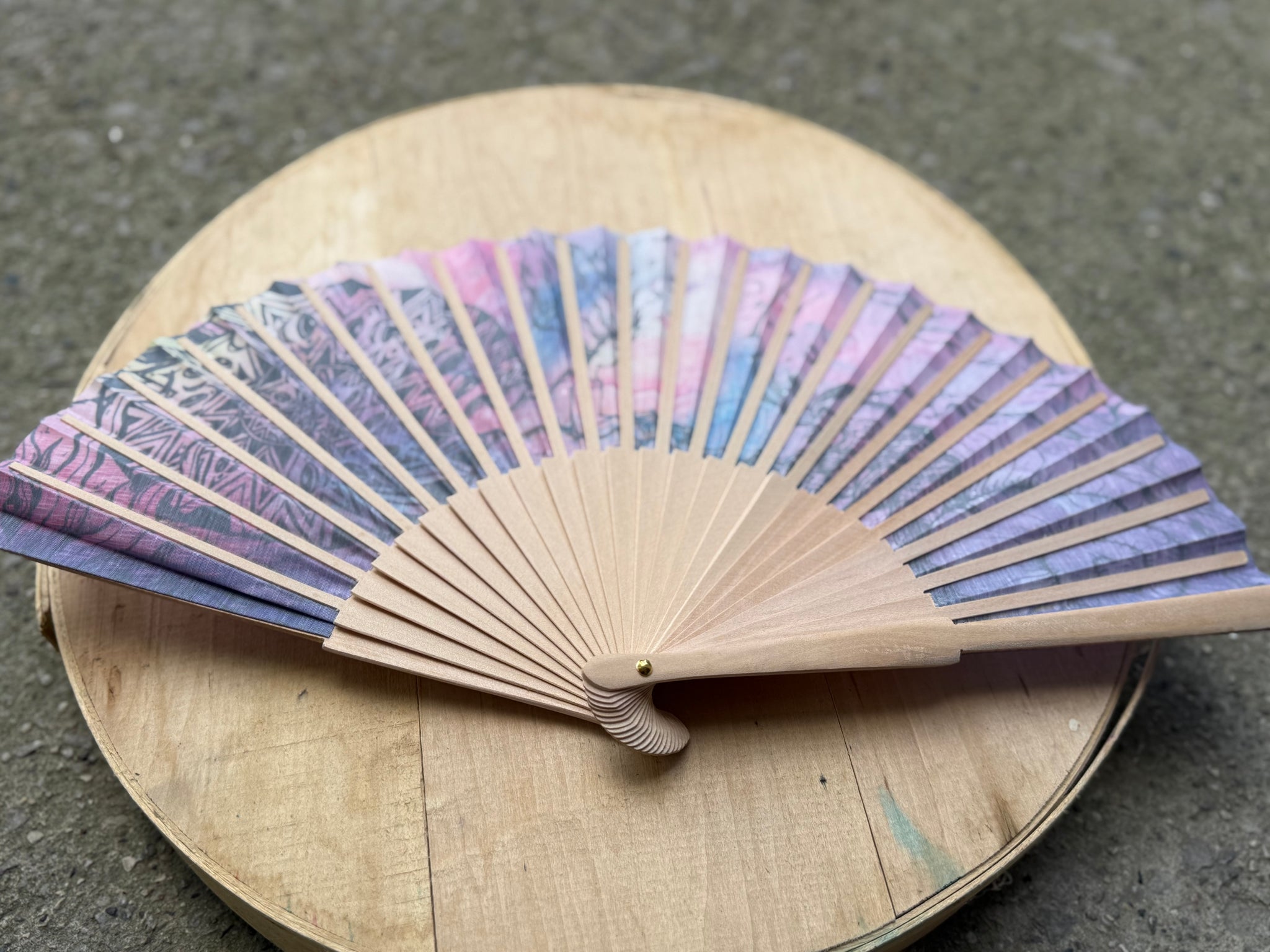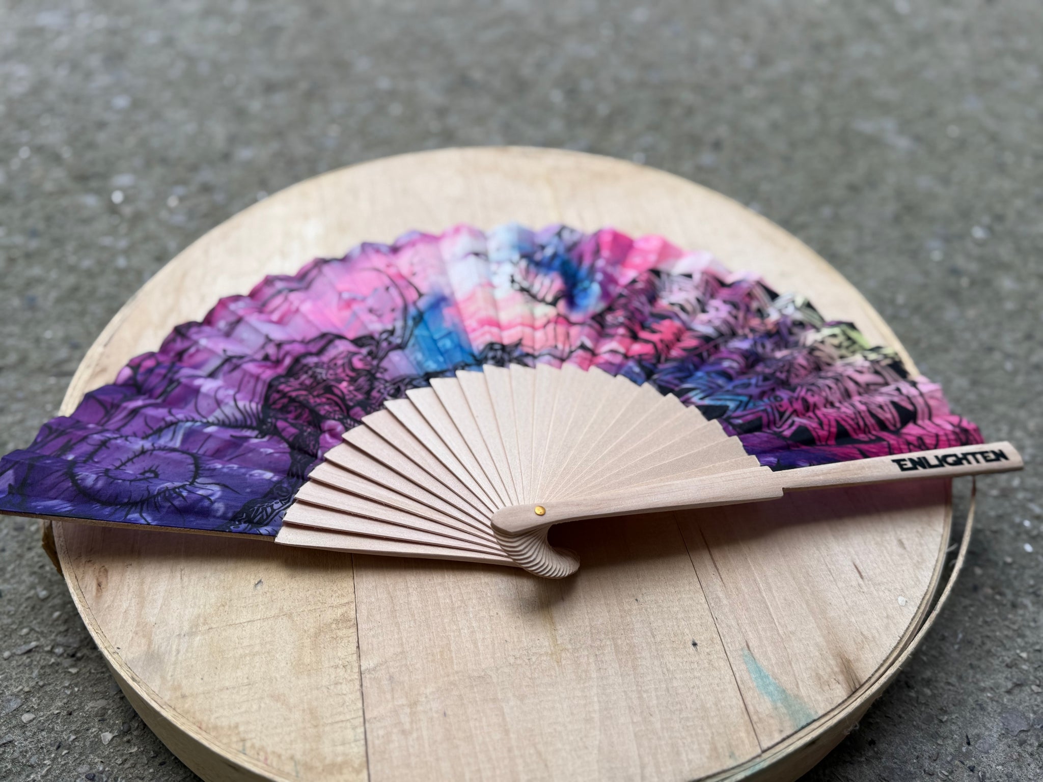 Made from sturdy bamboo wood and sublimated acrylic fabric, this fan is not only durable, but also provides a refreshing gust of wind to keep you cool during these long festival days and nights. This fabric will never fade or bleed so you can enjoy this stunning artwork for years to come. This beautiful fan was designed by the enlightened clothing company and Artists.