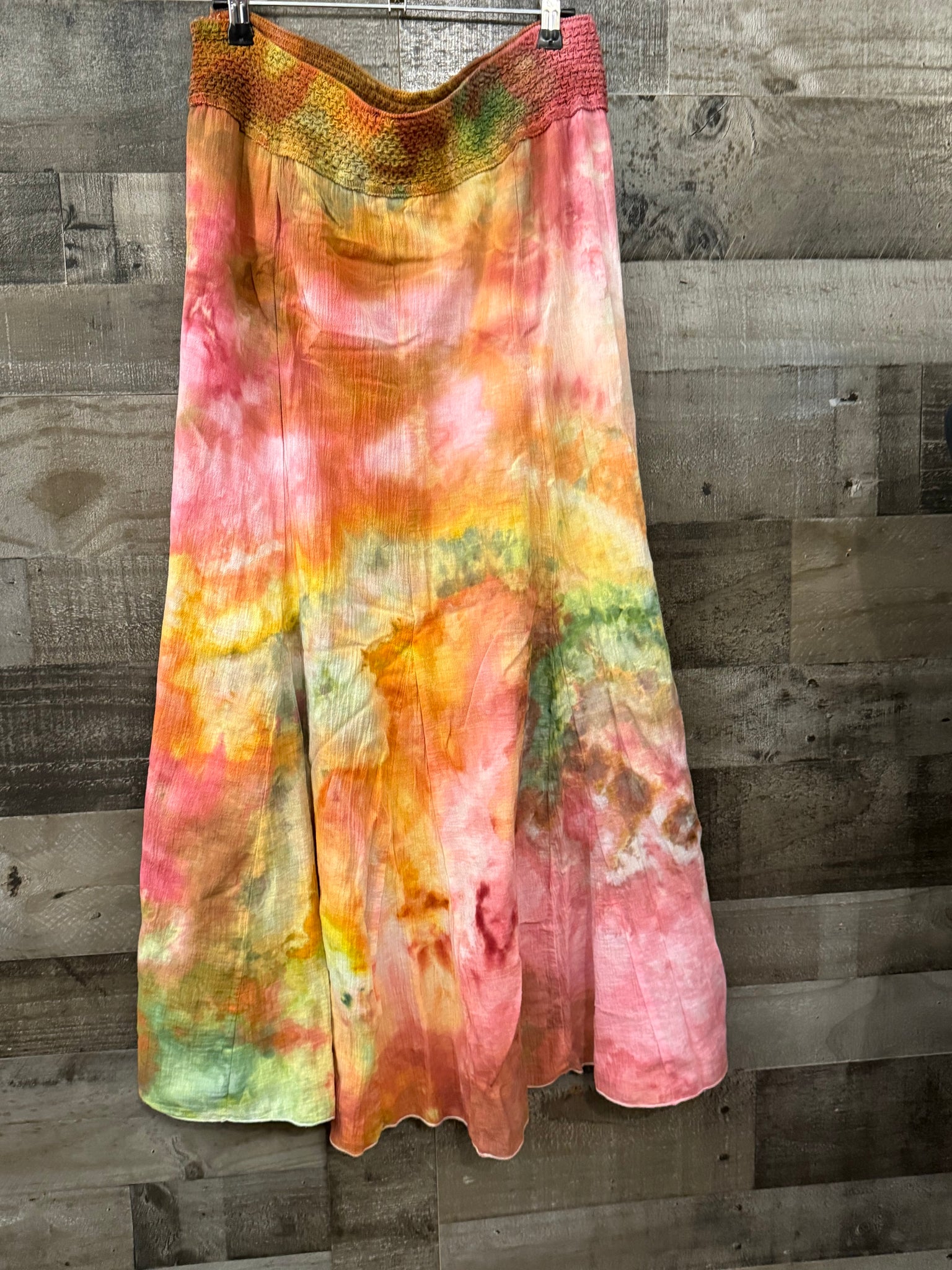Pretty hand dyed skirt with a crochet style waist…. Stretchy. 16-23 inches length 38/39 inches