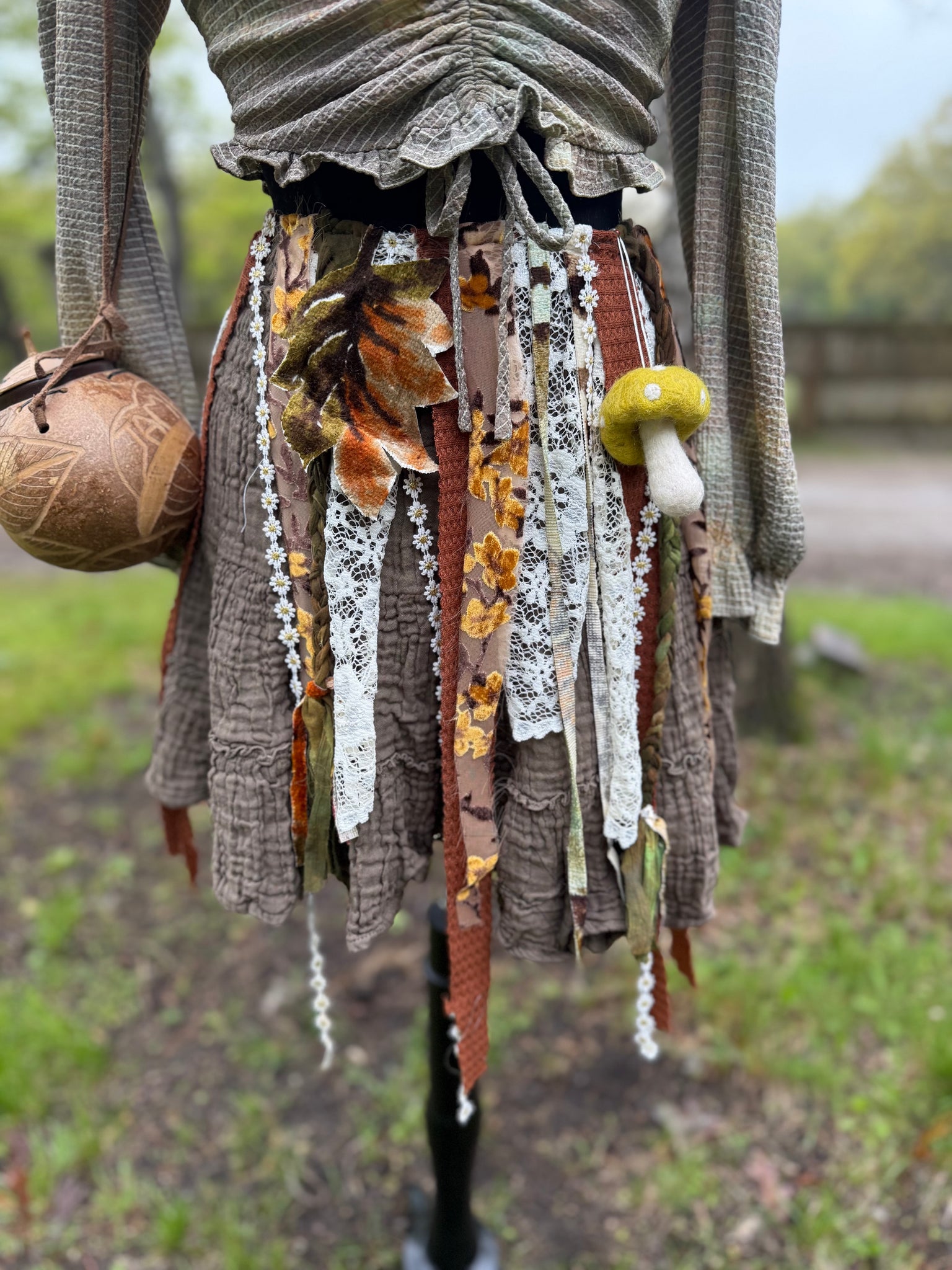 The Scrapoy skirt is constructed of a base skirt that will but a small/medium. The scraps were reclaimed from other projects and clothing.