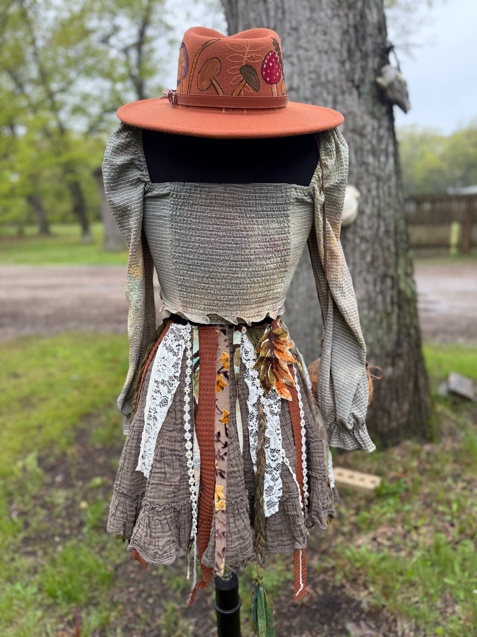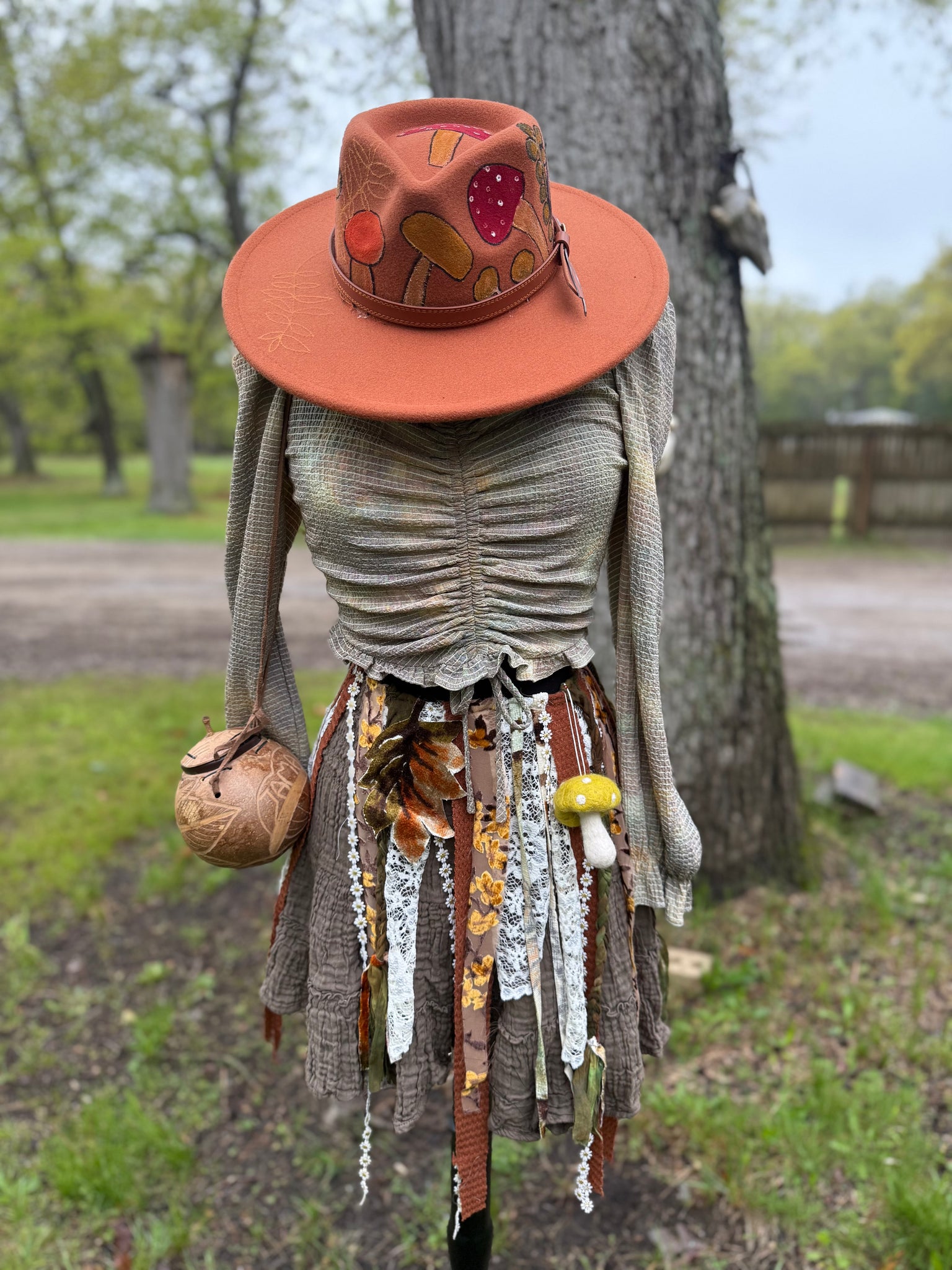The attached little mushroom is hand felted in Nepal and I will include a few other mushrooms to go with your outfit. It’s not attached to the skirt and can be moved around freely and you can add the other ones anywhere you would like. I will include pins as well.