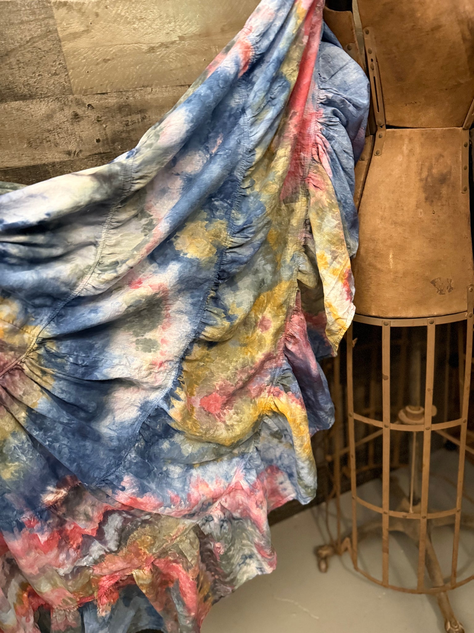 This is a beautiful hand dyed 12 yard skirt. This skirt has elastic and drawstring making it fit sizes small to 2xl (up to 48 inches).