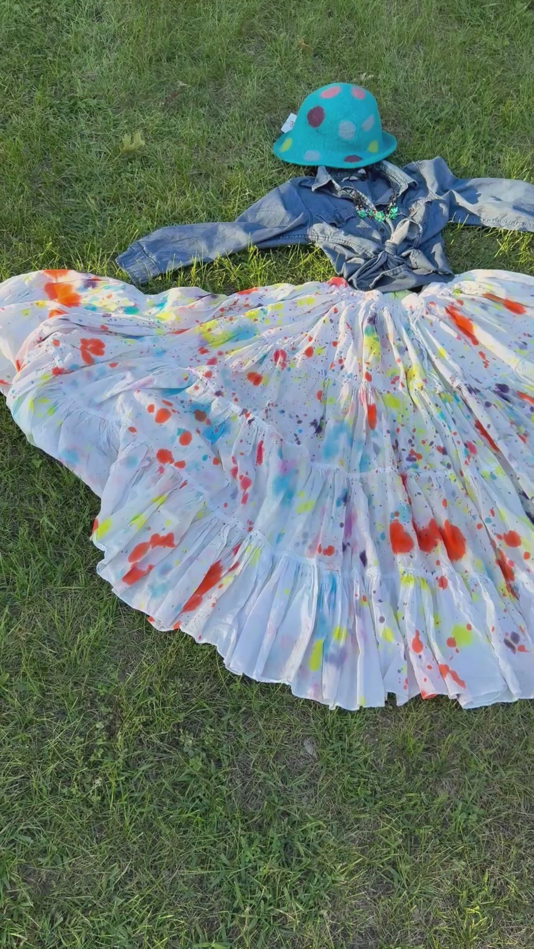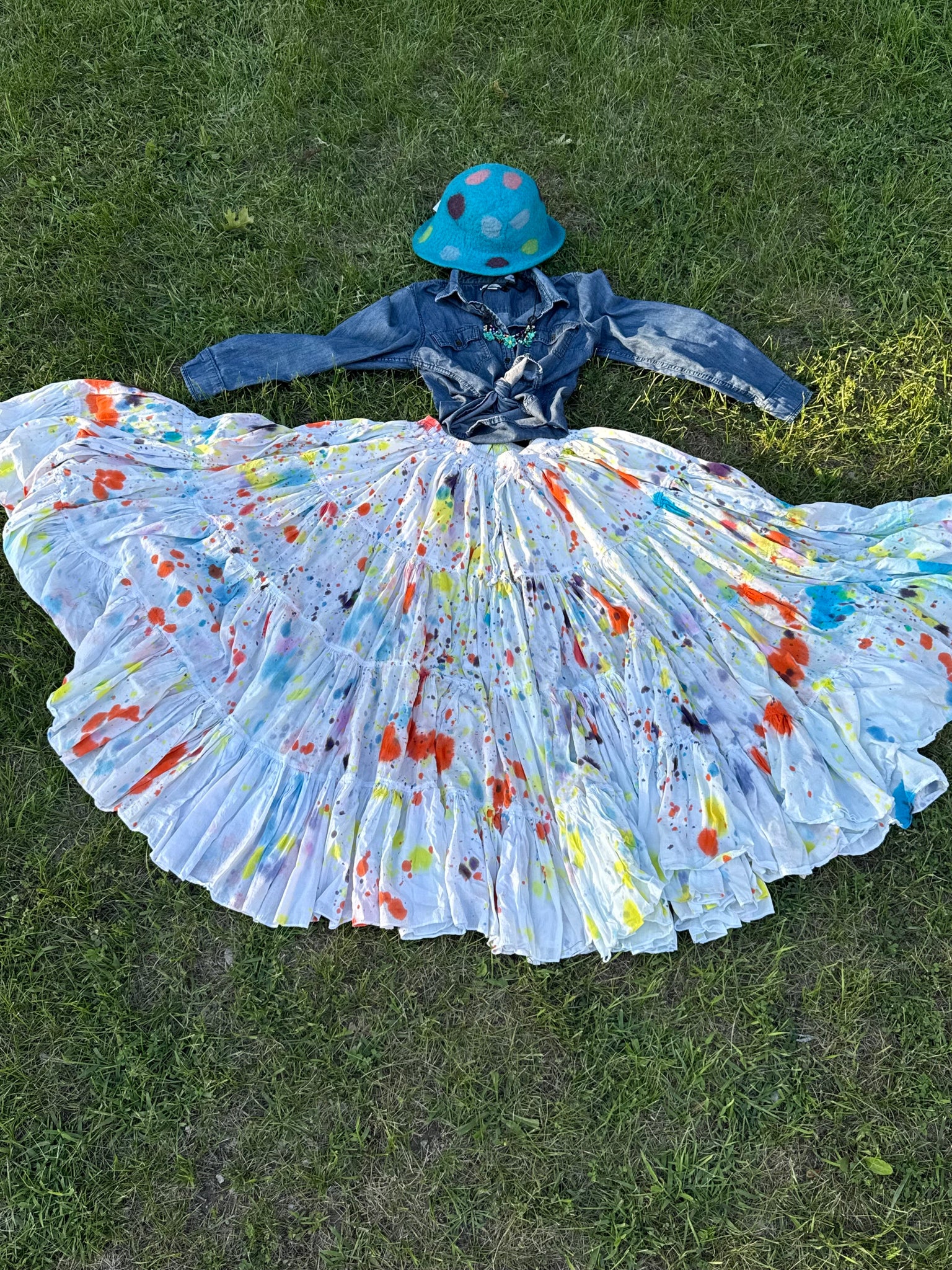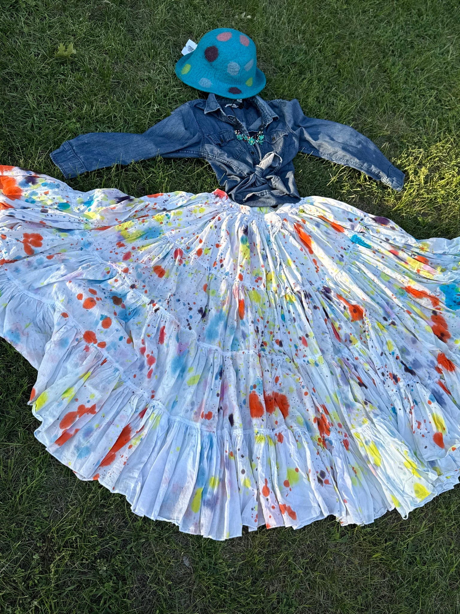This is a fun outfit for the polkadot lover, who loves to twirl. This hand dyed skirt (small to 2xl) is a 25 yard skirt with fun splatters. I paired this with a denim top (medium) and a polkadot necklace. I added a cute hand felted polkadot hat.